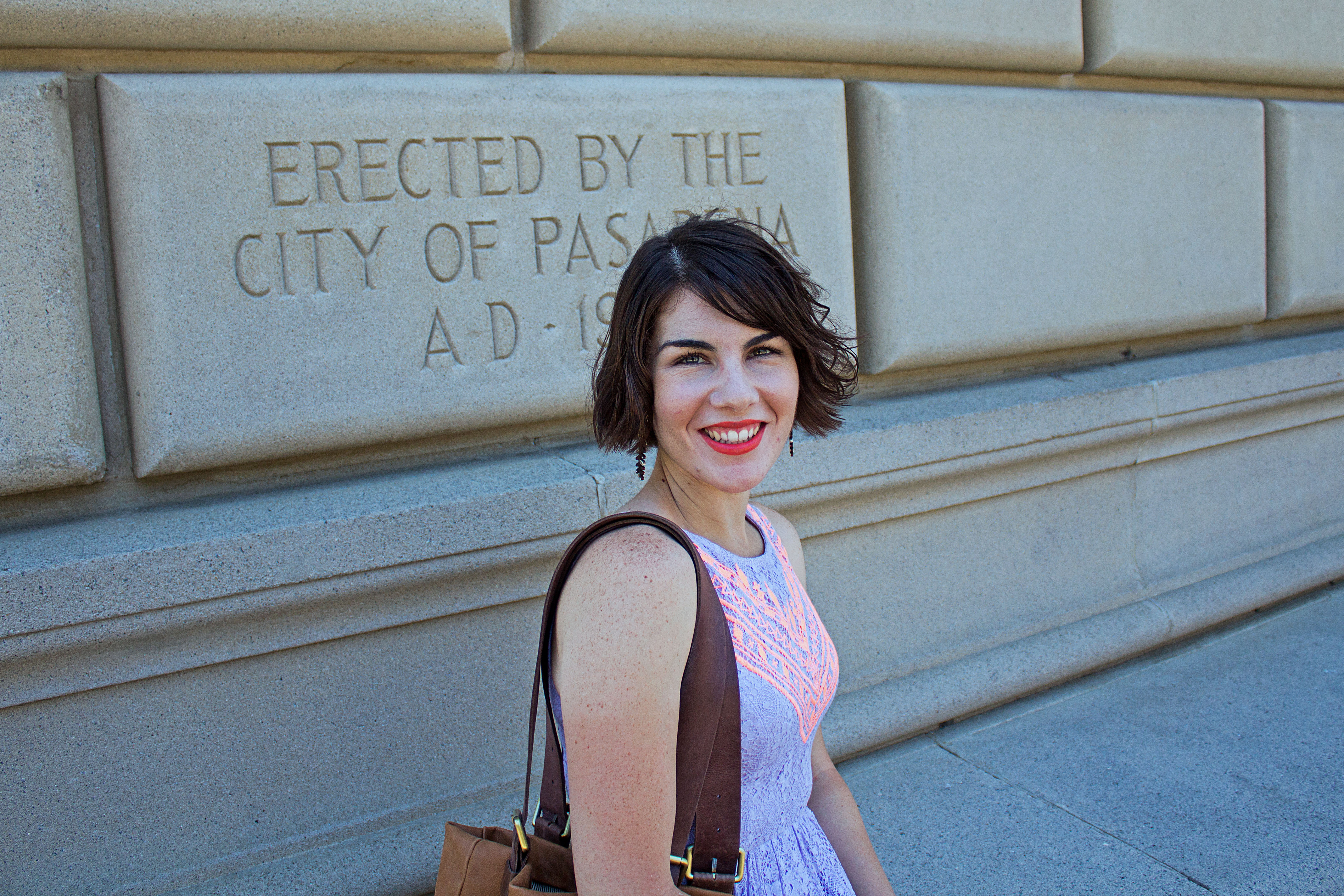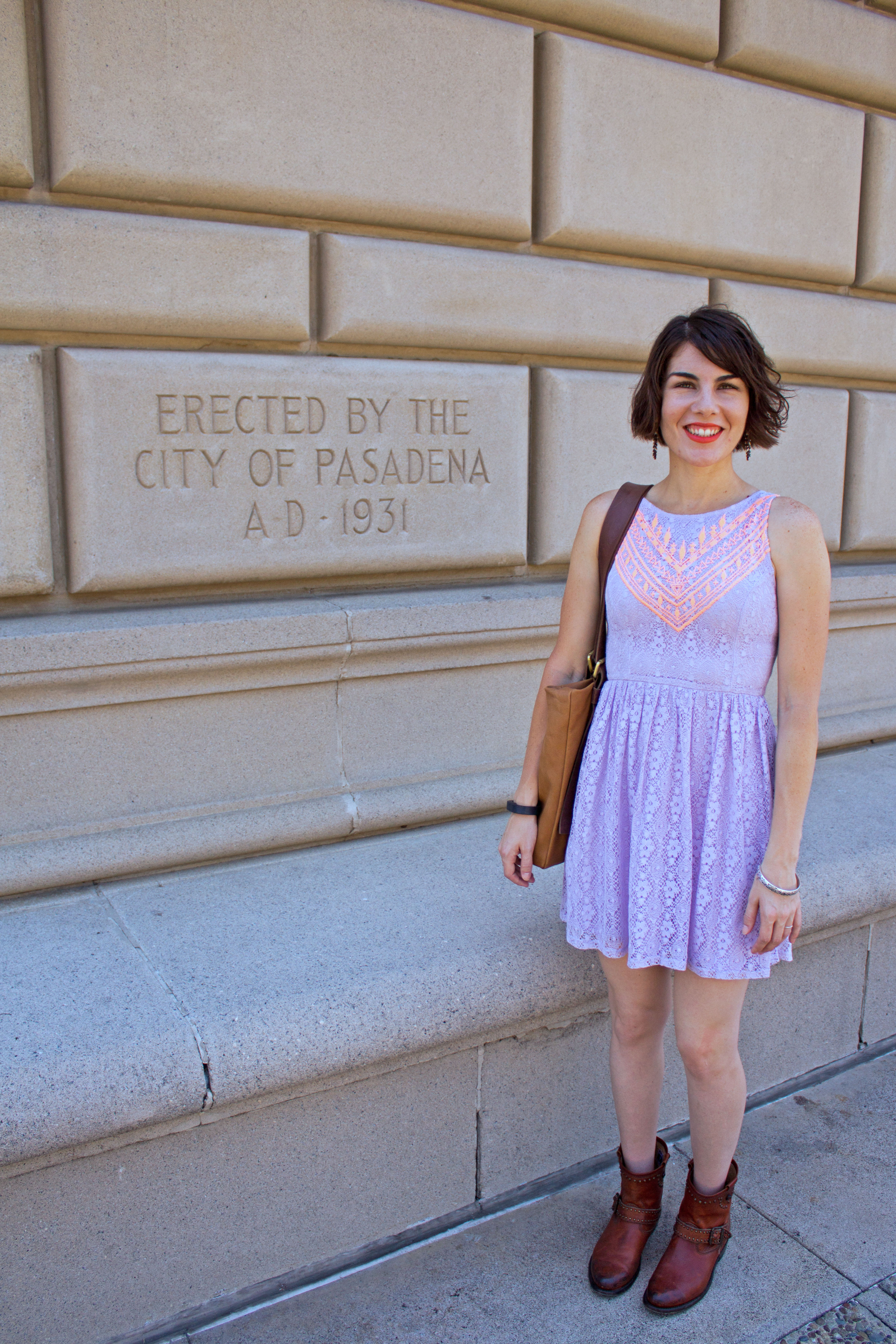 I really love booties and I am always looking for a new outfit to wear them with. Recently, I paired these studded ones with this fun purple lace dress with Aztec details. I was drawn to the bright colors of the dress and feel that they complement each other so well. The pairing turned out to be the perfect outfit for a day of exploring Pasadena and taking in the Sidewalk Chalk Festival. It was so inspiring to see the amazing artwork people created using chalk!